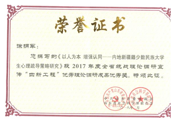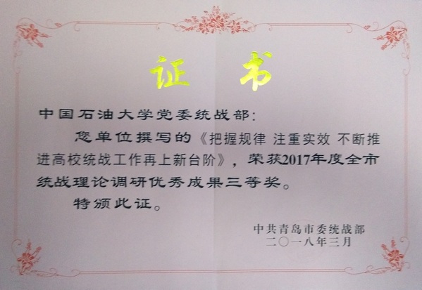近日,全省统战部长会议和青岛市全市统战部长会议召开,党委统战部部长王德钊参加会议。会上就一年来的工作进行了总结和表彰,我校多项成果获得省市表彰。其中徐拥军、孙鹏燕、李宝玺、葛长波等撰写的《以人为本 增强认同  内地新疆籍少数民族大学生心理疏导策略研究》获全省统战理论调研宣传“四新工程”优秀理论调研成果优秀奖;党委统战部选送的《把握规律 注重实效 不断推进高校统战工作再上新台阶》获青岛市统战理论调研优秀成果三等奖。