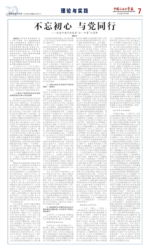 注:费祥历,男,校民进支部主委、理学院教授,从教36年,主要从事基础数学的教学研究工作,先后发表教学科研论文50余篇,主编的《高等数学》教材获得“山东省高等学校优秀教材”一等奖。在做好本职工作之余,积极参政议政,热心社会活动,具有较强的社会责任感。先后担任市区政协委员、东营市民进副主委。其中《关于大力宣传“黄河三角洲高效生态经济区”建设的建议》等多项提案,获市区政府关注并采纳。2003年来,连续担任3届省委统战部党外知识分子联络员,已提交30余篇意见建议,受到省委统战部领导的好评。今年恰逢中共中央发布“五一口号”70周年,费祥历教授从一个高校基层党派组织主委的角度出发,撰写此纪念文章。中间数易其稿,反复修改,遂成此文。