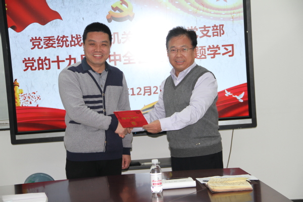 12月2日,党委统战部、机关党委联合党支部开展主题党日活动,依次组织了“读原文悟原理,学习全会精神”“同过政治生日,不忘初心使命”“参观图文展,领会石大精神”三个活动,支部全体党员参加,活动由党支部书记任晓东主持。