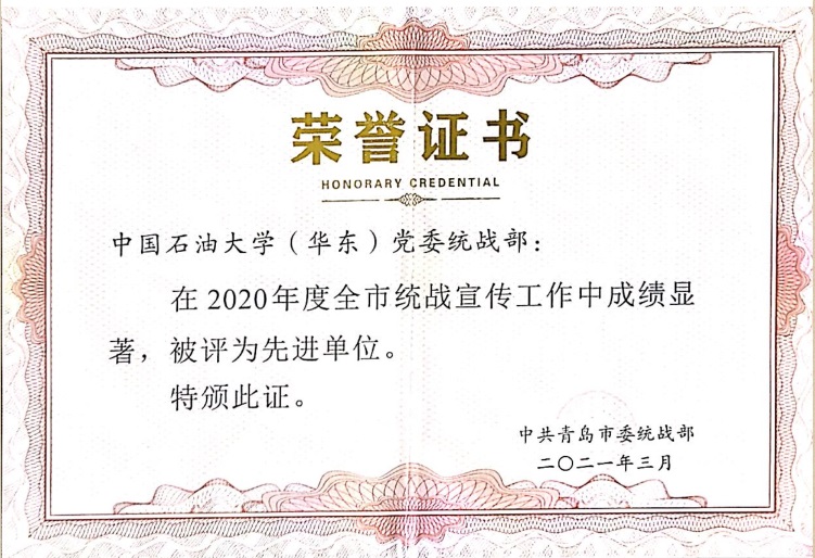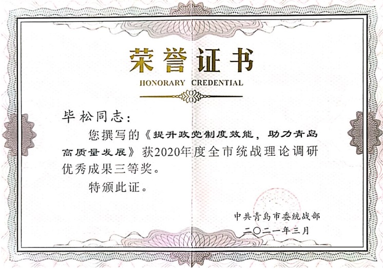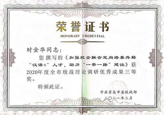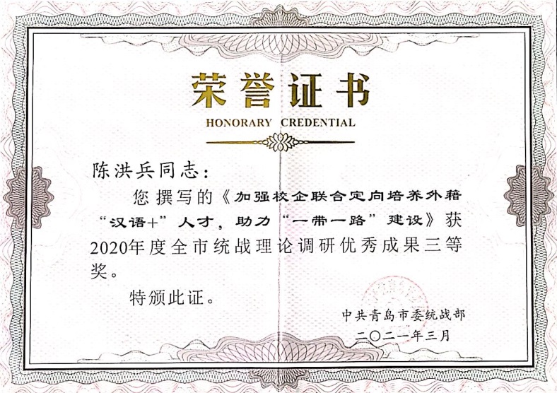 民革党员、国际教育学院陈洪兵、时金华老师撰写的《加强校企联合培养外籍“汉语+”人才,助推一带一路建设》,马克思主义学院毕松老师撰写的《提升政党制度效能,助力青岛高质量发展》获2020年度全市统战理论调研优秀成果三等奖。