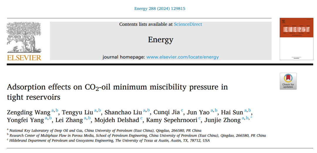 论文“Adsorption effects on CO2-oil minimum miscibility pressure in tight reservoirs”(《壁面吸附效应对致密储层CO2最小混相压的影响》)发表在能源领域国际知名期刊《Energy》。论文第一作者为石油工程学院2022级博士生王曾定,指导教师为钟俊杰教授。该研究揭示了纳米孔隙中壁面对油相重组分的选择性吸附效应对CO2最小混相压存在显著影响。通过构建新的理论计算方法,研究详细分析了壁面吸附效应在不同孔隙尺度下对混相压的影响程度差异,并进一步为构建油藏尺度最小混相压预测模型奠定了重要的理论基础。