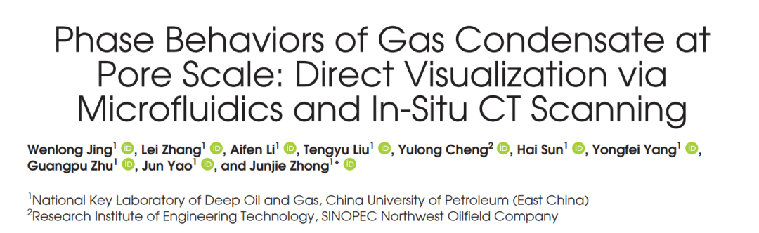 论文“Phase Behaviors of Gas Condensate at Pore Scale: Direct Visualization via Microfluidics and In-Situ CT Scanning”(《基于微流控与在线CT的孔隙尺度凝析气相行为研究》)发表在油气领域国际顶级期刊 《SPE Journal》。论文第一作者为石油工程学院2019级博士生景文龙,指导教师为李爱芬教授和钟俊杰教授。该研究聚焦凝析气藏开发过程中常见的反常凝析现象及露点压力检测问题,创新性地提出了微纳尺度油气相态检测芯片技术。该研究首次通过实验发现,在储层微纳米级孔隙空间中,凝析气的上露点压力显著高于体相值,且随着受限空间尺度的减小,上露点压力呈现升高趋势,指出了现有受限相态理论在预测凝析气露点方面存在的局限,对优化凝析气藏开发策略具有指导意义。