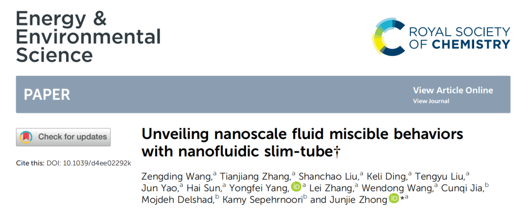 论文“Unveiling nanoscale fluid miscible behaviors with nanofluidic slim-tube”(《纳米细管技术:揭示纳米尺度流体混相行为》)发表在能源领域国际顶级学术期刊《Energy & Environmental Science》。论文第一作者为石油工程学院2022级博士生王曾定,指导教师为钟俊杰教授。该研究聚焦于致密/页岩油藏注CO2开发中亟需解决的最小混相压精确检测技术难题,创新性地结合微纳流控芯片技术与传统油气行业细管实验方法,提出了一种同时具备驱替效果和相界面可视化检测能力的纳米细管技术。该技术首次实现了对微纳跨尺度孔隙介质中混相压和混相过程的精确测量。研究发现,尽管纳米尺度下CO2与油相的最小混相压低于体相值,但在微纳跨尺度条件下,最小混相压却显著高于体相值。这一重要认识为致密/页岩油藏注CO2开发提供了新的理论认识。