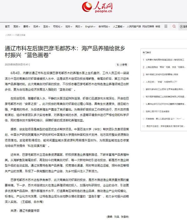 人民网:通辽市科左后旗巴彦毛都苏木:海产品养殖绘就乡村振兴“蓝色画卷”